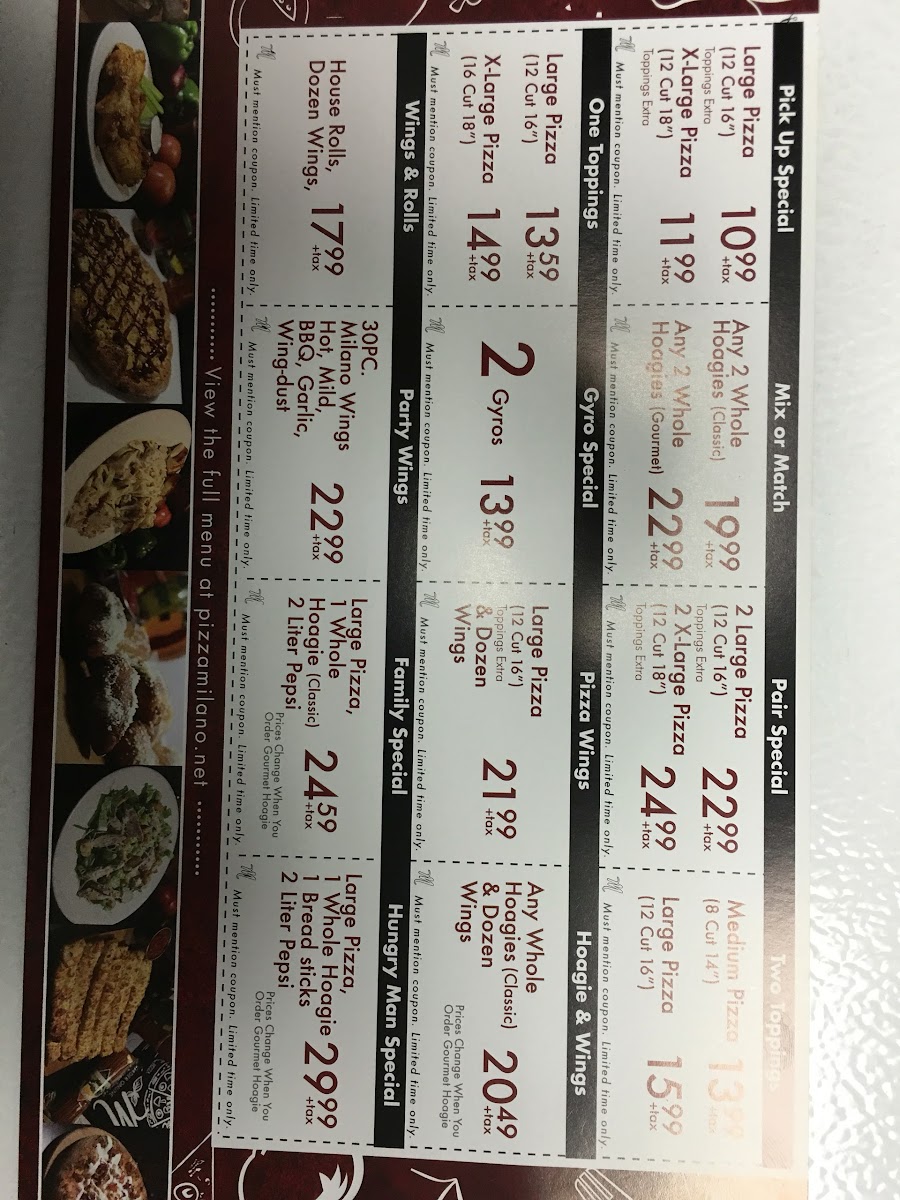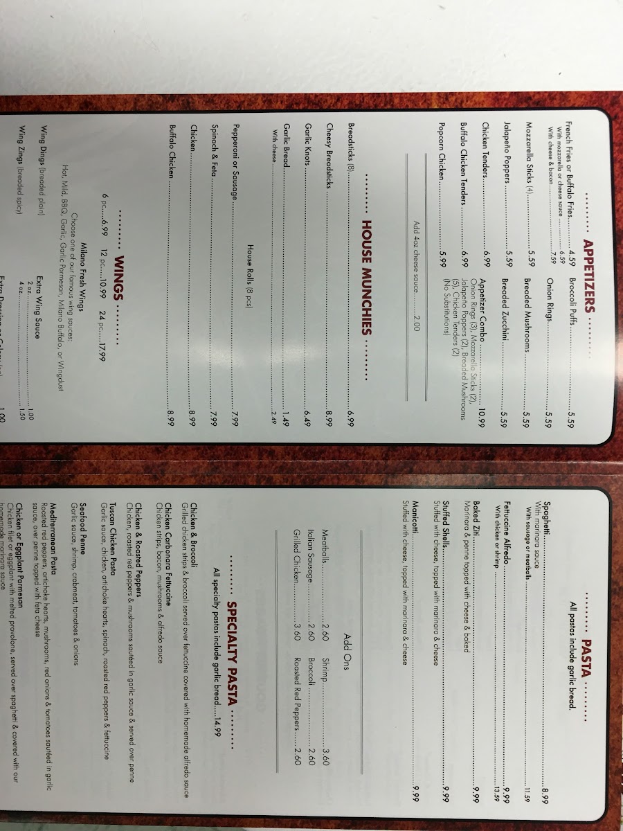 From a reviewer’s perspective, the menu at Mineo's Pizza offers a well-rounded and satisfying snapshot of classic comfort food with enough variety to please different cravings. As a conclusion to the menu experience, what stands out most is how thoughtfully the selections are grouped and how familiar favorites are executed with confidence. The Appetizers set the tone for a hearty meal, with crowd-pleasers like French Fries Or Buffalo Fries, Broccoli Puffs, Mozzarella Sticks, Jalapeño Poppers, and Chicken Tenders, all of which feel ideal for sharing and warming up the appetite. Moving into the sandwich offerings, the Hoagies section feels dependable and filling, highlighted by options such as Chicken Parm, Seafood, Tuna, Cheese Burger, and Eggplant, each appealing to a different taste preference, from classic Italian-inspired flavors to simple American comfort. For those looking for something more adventurous, the Gourmet Hoagies elevate the experience with bolder combinations like Mediterranean, Bbq Chicken, Tuscan Chicken, and Ranchero Steak Or Chicken, giving the impression of more layered flavors and generous portions. The Calzones further reinforce the menu’s strength in indulgent, baked specialties, featuring satisfying choices such as Chicken, Steak, Seafood, and Buffalo Chicken, all of which feel like complete meals on their own. Finally, the Others section rounds out the menu with pasta-based comfort dishes including Chicken Carbonara Fettuccine, Tuscan Chicken Pasta, Seafood Penne, Chicken & Broccoli, and Chicken & Roasted Peppers, offering a reassuring balance for guests who want something beyond pizza and sandwiches. Taken as a whole, Mineo’s Pizza menu leaves the impression of a restaurant that knows its audience well-delivering familiar, filling dishes with enough variety to keep diners coming back, and closing the menu experience on a note of consistency and comfort rather than unnecessary complexity.
